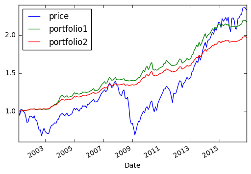 return a[['price','portfolio1','portfolio2']].plot() 由此得到的地块: