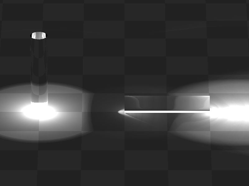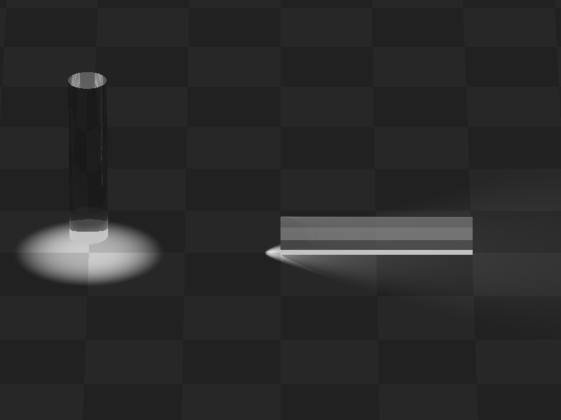 在这张图片中,我将光源直接放置在玻璃管的上方和左边,其指数为1.3。但我没有看到任何预期的工件(证据),光是通过管道和反射的棋盘表面。