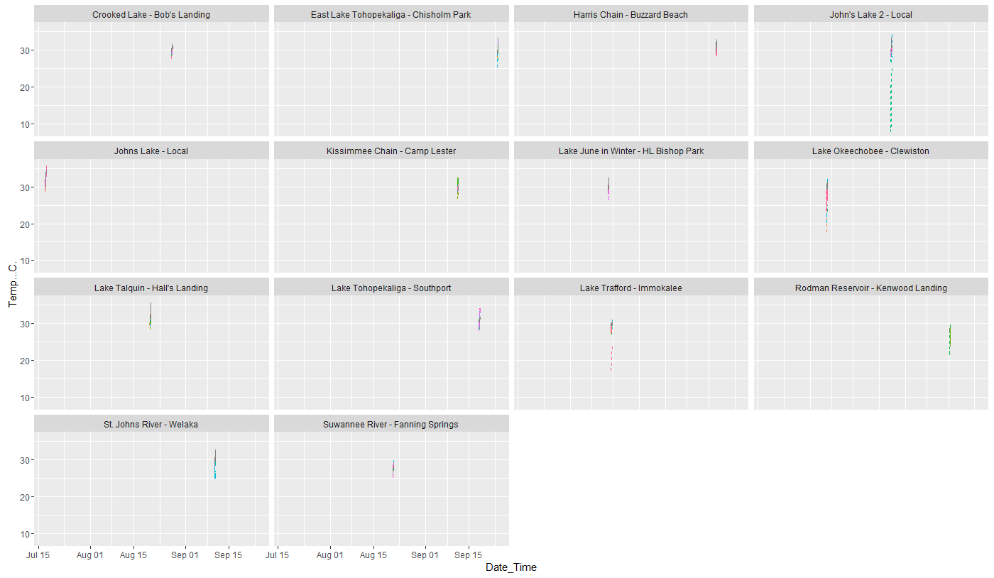 9/12/2016 14:02:00 26 Militello & Culberson Lake 3我有一个从低音生活良好研究的数据集,在那里我监测的温度在垂钓者的活井通过放置一个临时记录器在他们的活井在整个比赛一天。我的问题是,是否有一种方法来绘制温度随时间的变化,由水体分面,然后由独特的垂钓者的名字编码的颜色。我不确定最快的方法是否是按水体(我工作过的14个水体)子集,创建14个新的单个数据集,为单个水体绘制一个图,然后使用类似于grid.arrange的东西来安排它们。当我试图为所有的水体绘制一个单一的平面图时,我想要解决的问题是使x轴限制成为一个标准的小时范围,不管日期如何(对于我来说,我的真实数据可能是下午7:00-3:00,因为这大约是大多数比赛持续的时间)。但是由于这项研究是在多个月内进行的,R想用整个3个月作为x轴的极限。