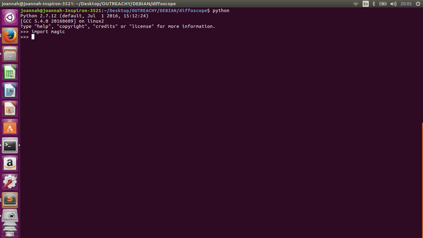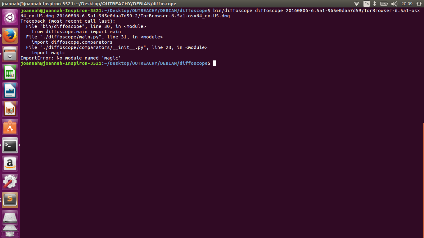 您已经为Python2.7安装了magic,但是Diff运使用Python3和明确推荐存储库中的包python3-magic,这个包可以与sudo apt-get install python3-magic一起安装。为Python2.7安装的模块不一定与Python 3共享,因此,如果2.7也需要这两个版本,则可能需要同时安装这两个版本。