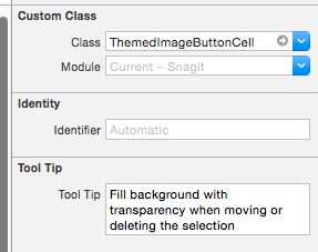 小心,如果在InterfaceBuilder中单击该按钮,您可以将工具提示添加到按钮中,并且显示在“自定义类”下的类(右上)是NSButton。但是,如果再次单击该按钮,就像选择xcode中的内容一样,所选择的是NSButtonCell,它似乎有一个单独的工具提示。如果您不小心,可以将工具提示添加到NSButtonCell而不是NSButton中,并且它不会显示在运行中的应用程序中。