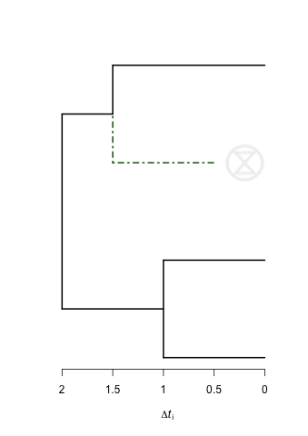 plot(rec1,show.tip.label = F,edge.color = c("black","black","black","black","darkgreen","black"),edge.width = 2,edge.lty = c(rep(1,4),4,1))发布于 2016-10-24 11:52:04