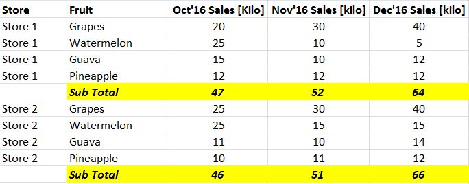 如下表所示,我想按商店添加除“西瓜”之外的所有行的小计,但在表中显示“西瓜”销售行。如果可能的话请告诉我。