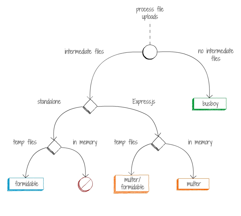 您可以将可用的文件处理库分为三类:它们是独立的还是Express.js特定的,它们是存储中间文件还是使用流,如果中间文件存储在临时目录中还是存储在内存中。