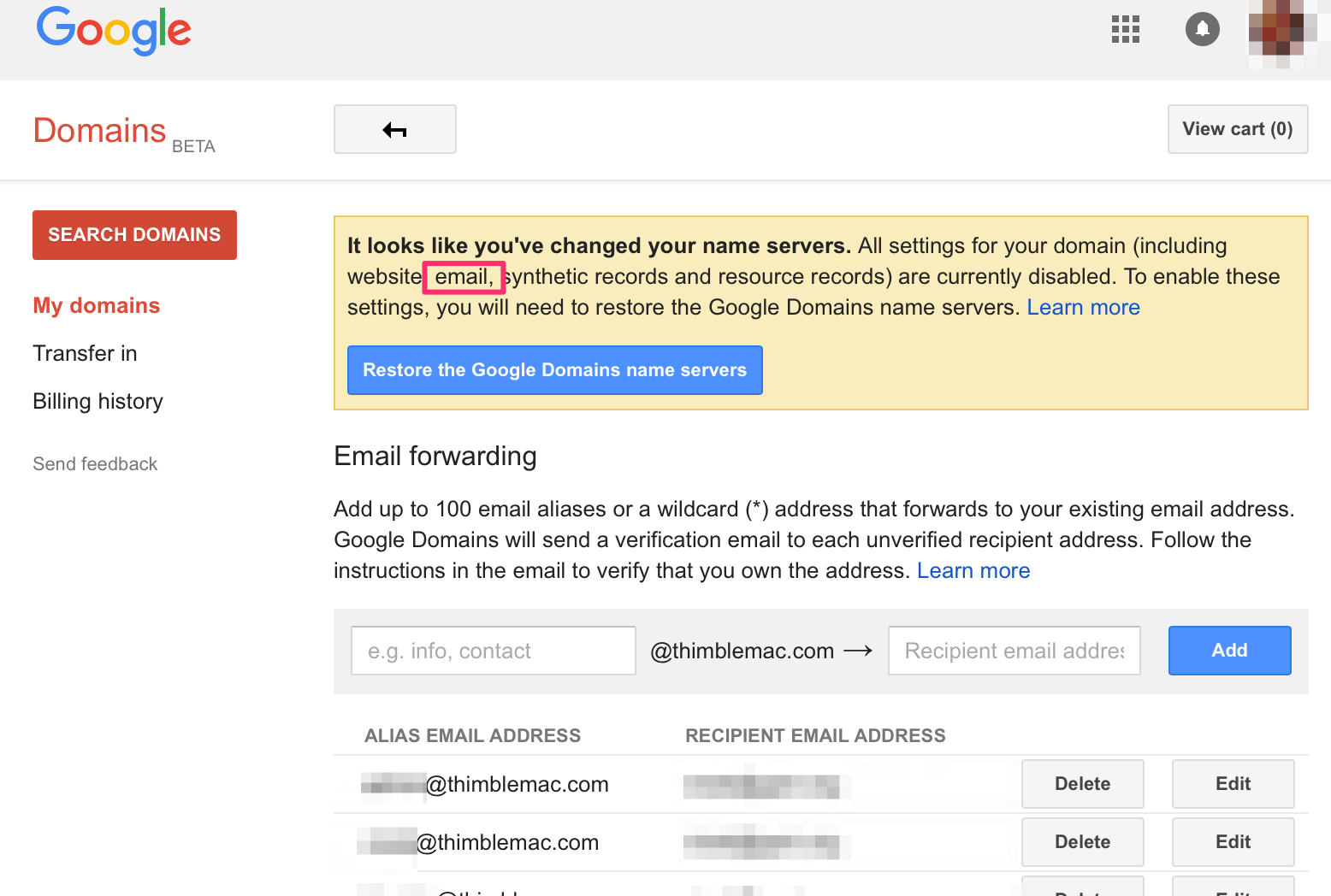这样做显示了一个警告谷歌域,我的电子邮件现在是禁用的,我必须恢复谷歌域名服务器。