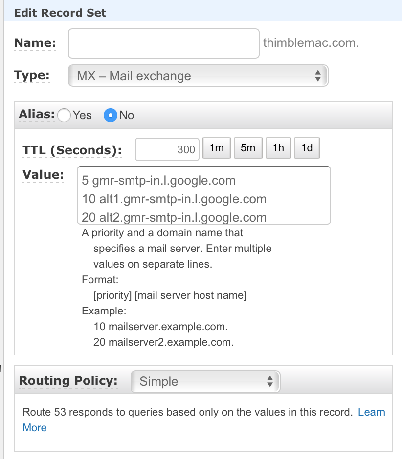 我注册了我的域名谷歌域名,它有一个免费的电子邮件转发服务,但出于各种原因(主要网站是基于S3的w/ cloudfront,亚马逊的免费ssl等)我决定使用route53作为域名域名系统。