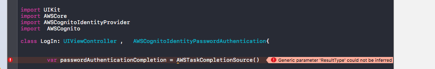 let passwordAuthenticationCompletion: AWSTaskCompletionSource<AWSCognitoIdentityPasswordAuthenticationDetails> = AWSTaskCompletionSource()https://stackoverflow.com/questions/40106004