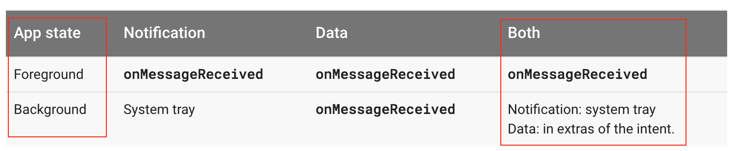 通知是在应用程序处于后台时传递的。在本例中,将通知传递到设备的系统托盘。默认情况下,用户点击通知就会打开应用程序启动程序。 具有通知和数据有效负载的消息,包括后台和前台。在本例中,通知被传递到设备的系统托盘,数据有效负载在启动程序活动的目的之外传递。