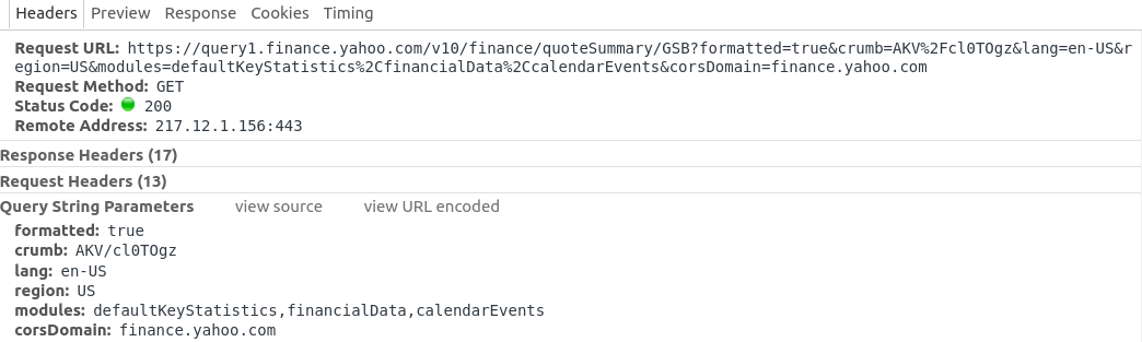 ...: url = "https://query1.finance.yahoo.com/v10/finance/quoteSummary/GSB"