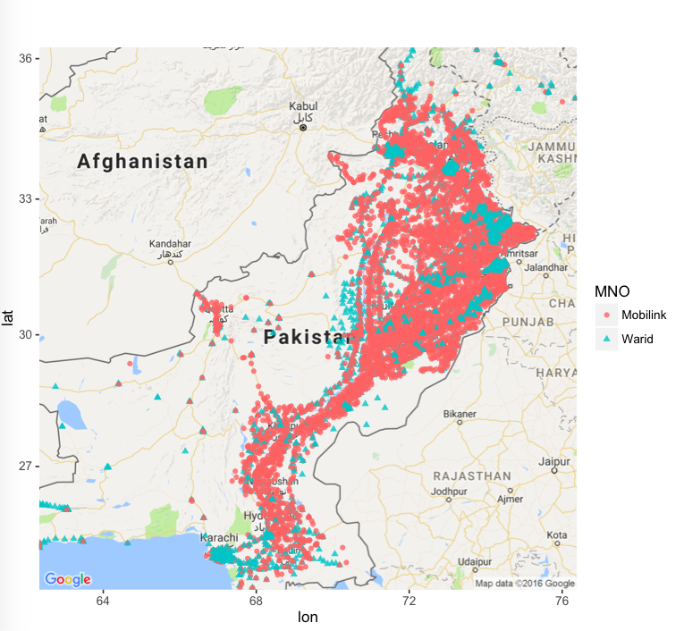 同时,我使用ggplot2软件包绘制了巴基斯坦不同移动网络运营商(大约13000个塔)的各个塔的地理坐标。产出如下: