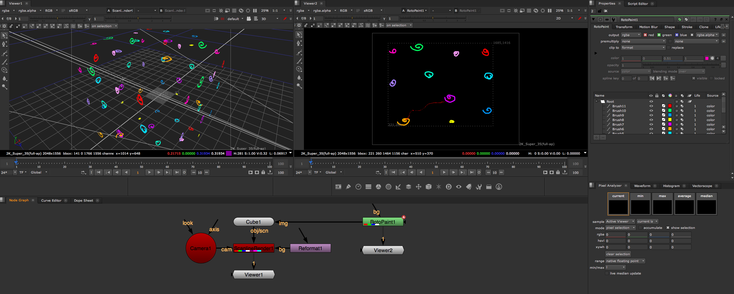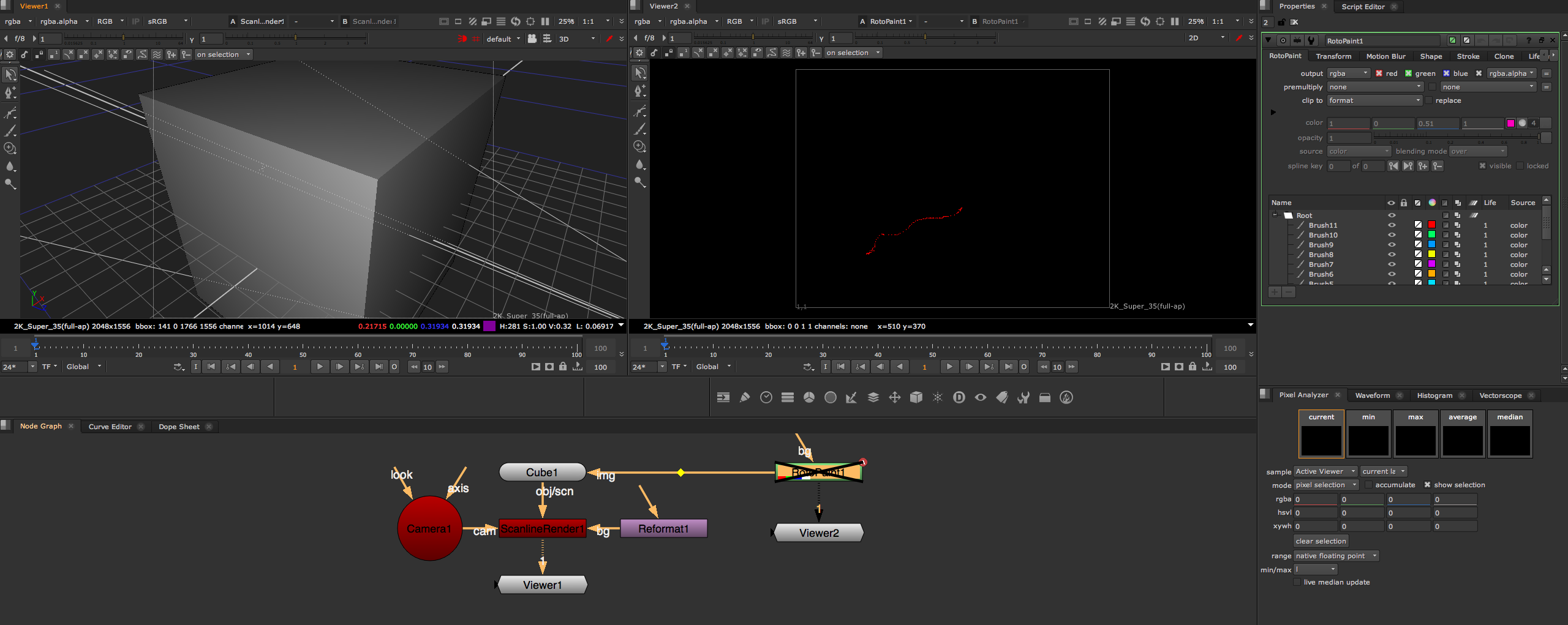 这里有一个Nuke的Python脚本,用于创建摄像机的投影矩阵,并使用画笔作为纹理映射。其背后的想法,是投射所有物体的三维纹理在查看器,以屏幕空间通过当前选定的相机使用油漆笔画。