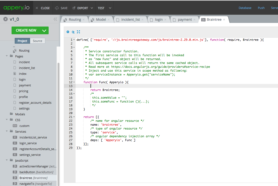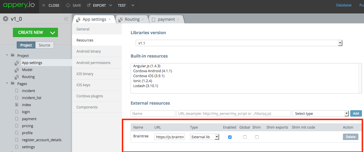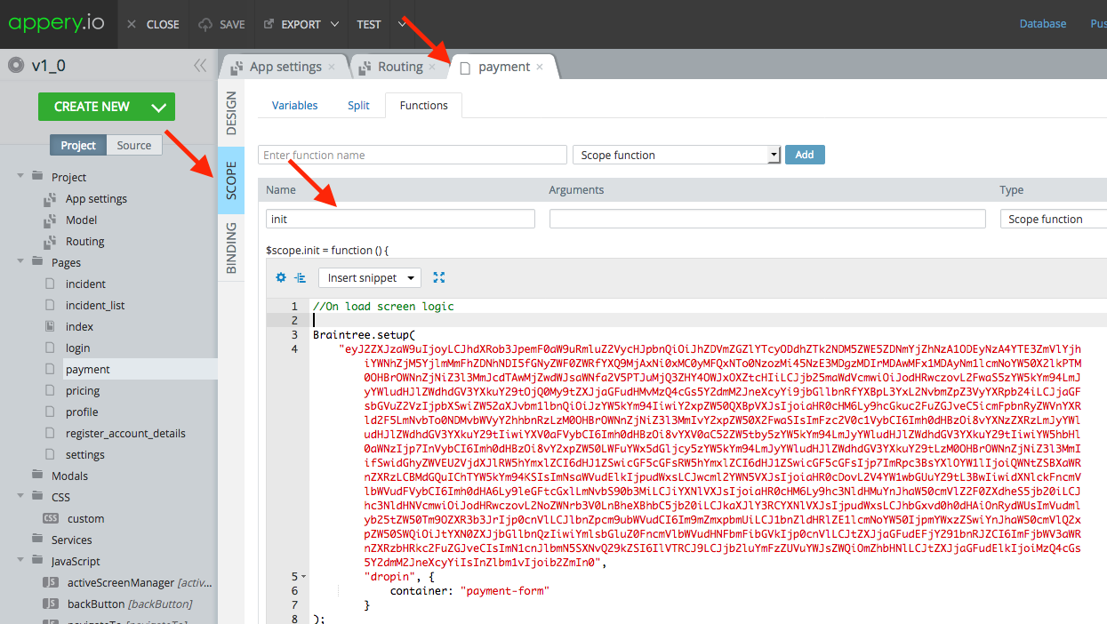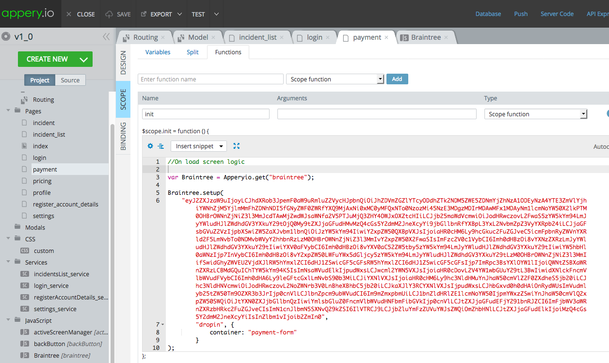 注意:在网站上,代码使用的是Braintree.setup()而不是braintree.setup()。我切换到了Braintree.setup(),因为braintree.setup()给了我一个错误,说明braintree没有定义。我不确定Braintree是否是在资源部分中定义的变量,Appery在该部分中将脚本中的任何值分配给变量。