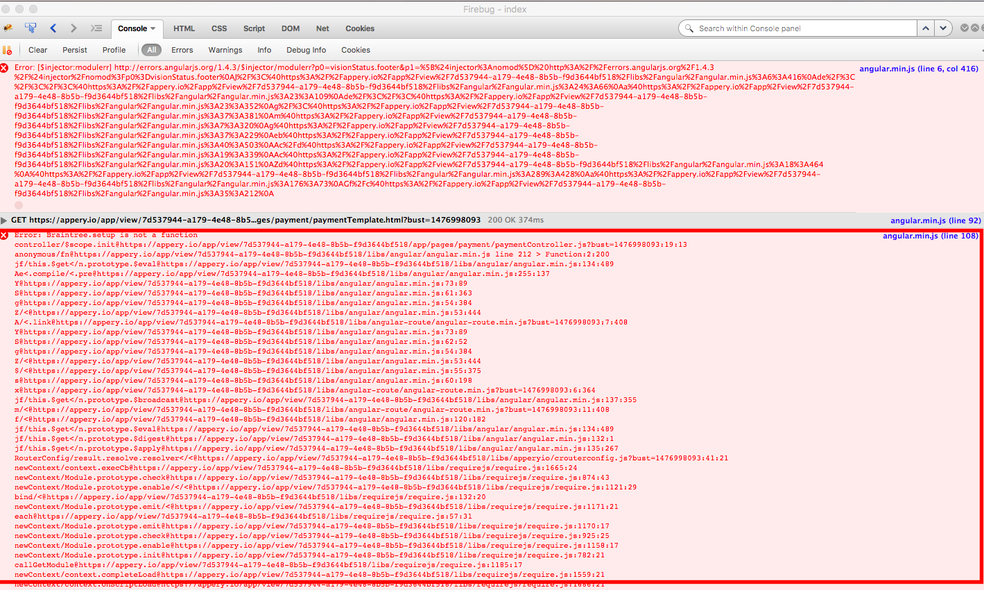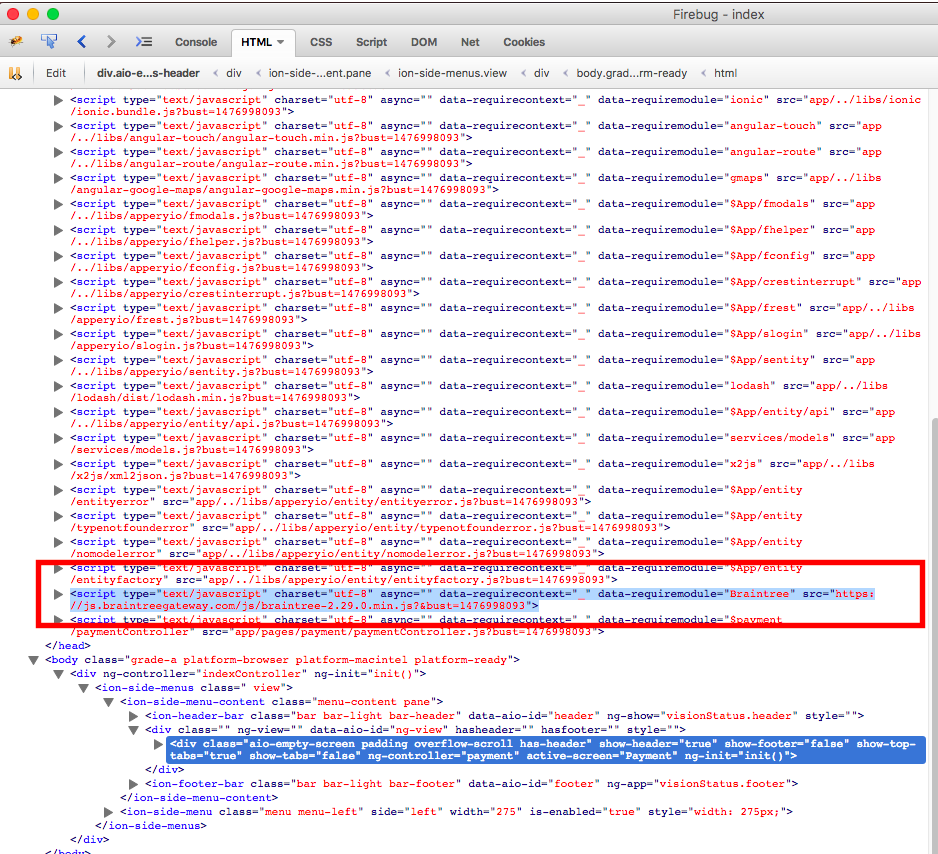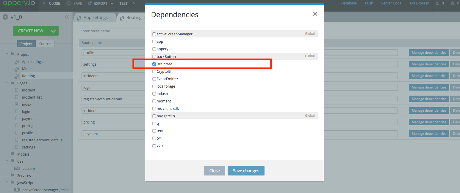 注意:在网站上,代码使用的是Braintree.setup()而不是braintree.setup()。我切换到了Braintree.setup(),因为braintree.setup()给了我一个错误,说明braintree没有定义。我不确定Braintree是否是在资源部分中定义的变量,Appery在该部分中将脚本中的任何值分配给变量。