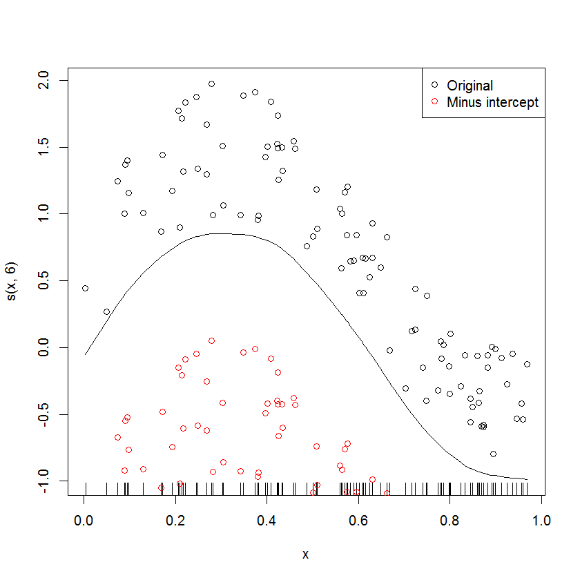 我注意到了mgcv中类似的东西,它可以通过提供shift参数和模型的截距值来解决(因为平滑看起来是中心的)。我原以为这也是真的,所以我从原始数据点中减去了截距。然而,上面的情节表明这个想法是错误的。我不知道额外的轮班是从哪里来的。我希望这里有人能帮我。