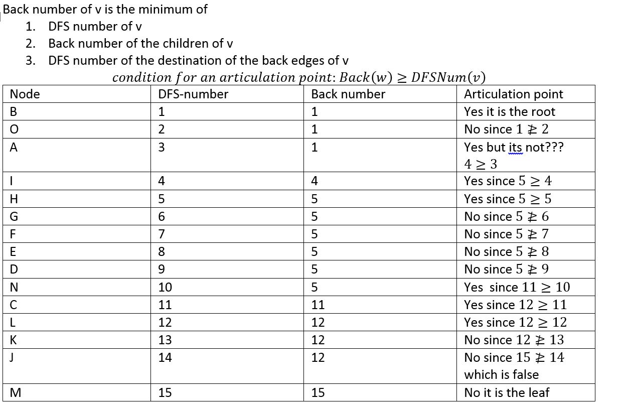 我在实现(而不是代码) DFS时遇到了困难,它包含了双组分算法来查找图形中的连接点,该算法是在我的计算机科学讲座中提出的,而我没有掌握实现。(为了澄清我知道如何实现DFS),让我解释一下:我们得到了一个图,我们必须执行一个DFS来使用back数字和DFS编号来查找所有的发音点。我的主要问题是使用给定的算法找出每个节点的后退数。