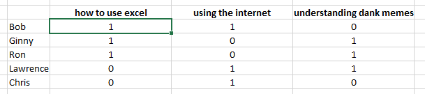 例如,您可以向G2:=COUNTIFS($B:$B,$F2,$A:$A,G$1)+COUNTIFS($C:$C,$F2,$A:$A,G$1)+COUNTIFS($D:$D,$F2,$A:$A,G$1)添加一个转换单元
