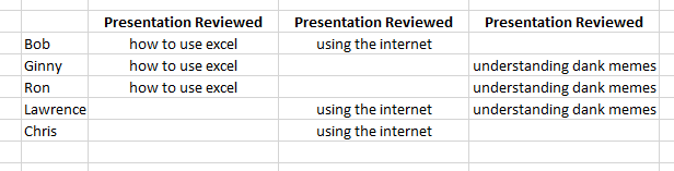 我通常会在这个场景中使用VLOOKUP或HLOOKUP,但是我有多个用户查看相同的表示,因此这些选项不能工作,因为它们只返回第一个实例,而不返回任何后续实例。任何帮助都是非常感谢的。