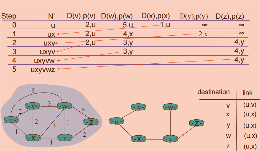 当我们在UX时,我们可以通过将X到V(这是2)的成本加到我们当前的成本(即1;UX的成本)。所以,之和是3,但由于这个,我比我们已经找到的2大,所以我们不会改变它。在第一步中,我们有两个选择,它们都有相同的成本: UXY和UXV,但是为什么算法选择选择UXY而不是UXV呢?