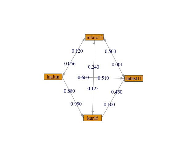 格兰杰因果关系(F统计量的p值)位于边的两边。我把p值放在每个箭头的开头。我用更多的强调引出了近乎重要的因果关系.