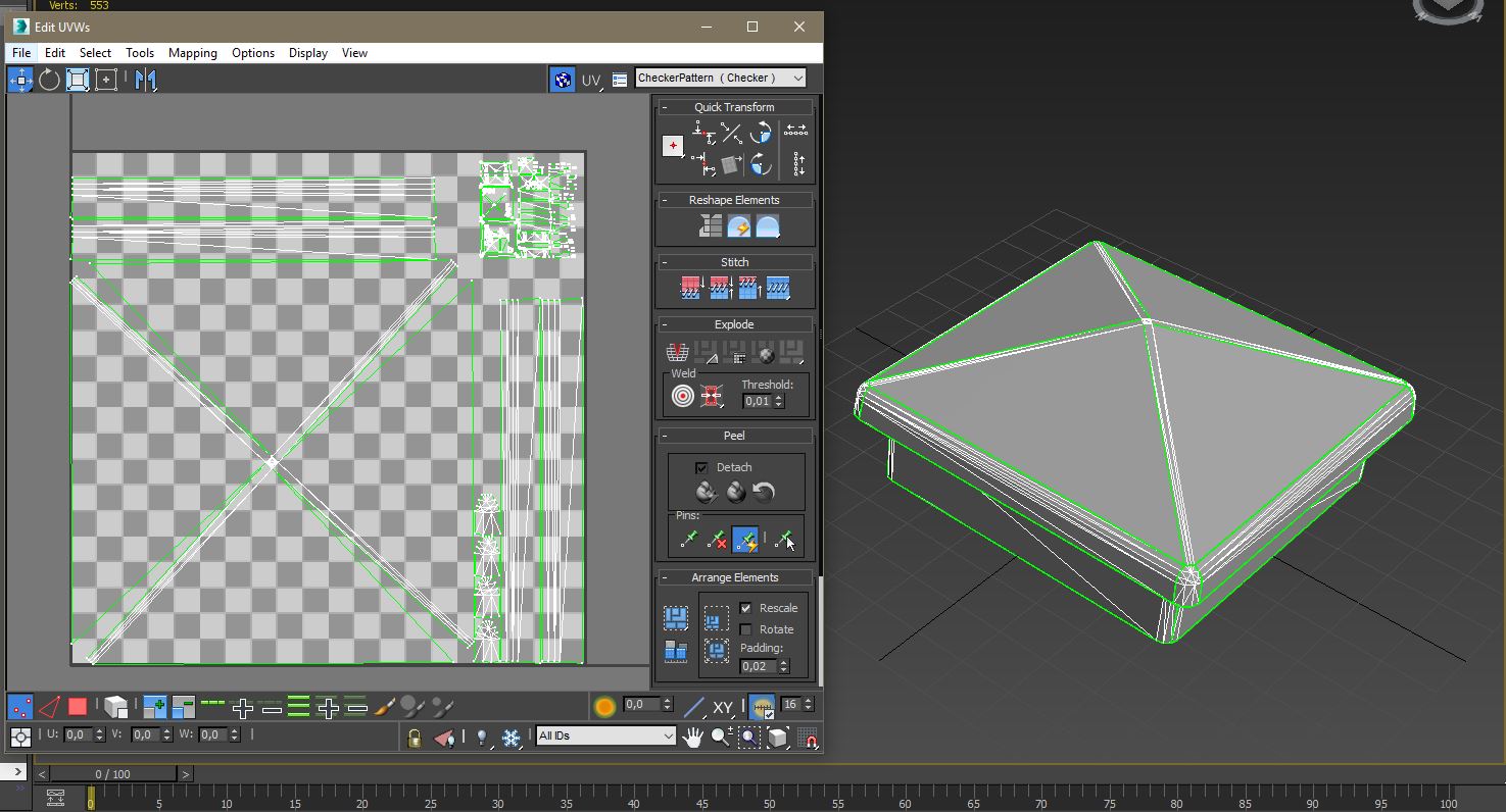 UVWs和object的截图。UVW的无用部分在右上角分组。
