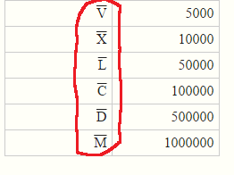 您可以使用unicode "\u0305",它是组合过行。因此,在5000,你可以做System.out.println("V\u0305")。10000,System.out.println("X\u0305")等。