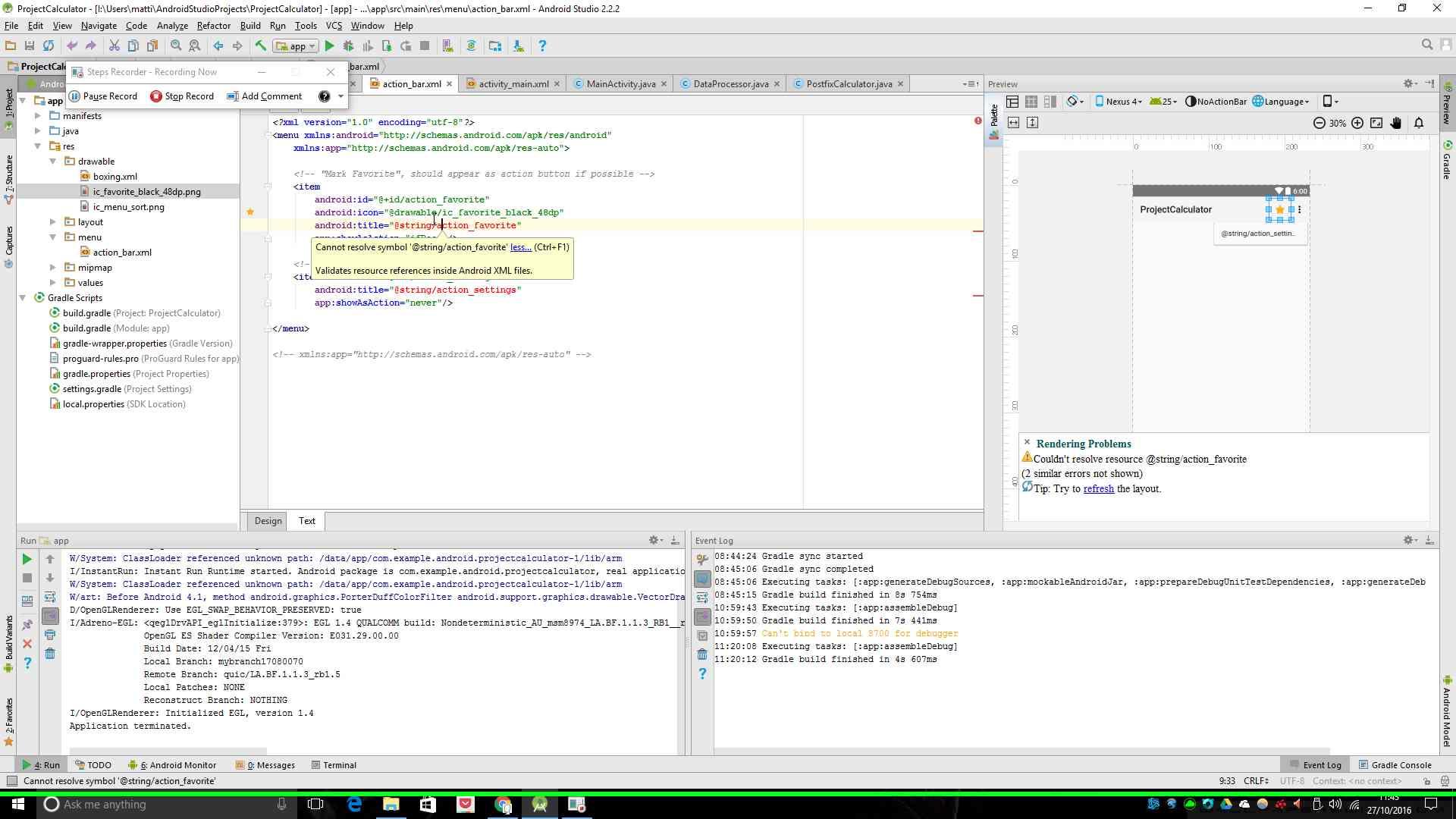 我正试图在我的android应用程序中第一次设置一个动作栏。我确实是一步一步地遵循着https://developer.android.com/training/appbar/actions.html的指令,但是它不起作用.我得到的错误信息是,如果我在google上搜索它,它会给我与我的完全不同的情况.(我不能插入整个代码,因为太多了,所以我只插入了一个相对于操作栏)