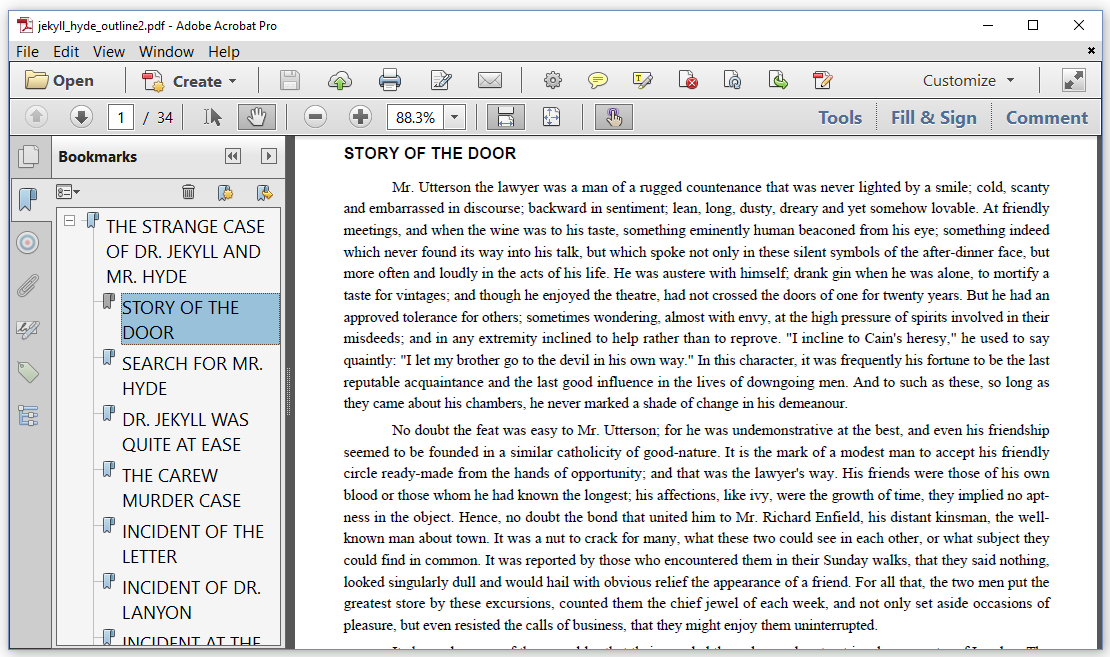 有关如何创建章节的示例,更具体而言,是书签面板中相应的大纲,请查看iText 7:积木教程。本教程有一个反复出现的主题:小说“Jekyll博士和Hyde先生的奇怪案例”。