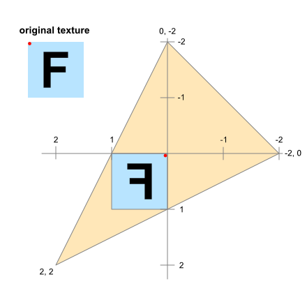 GL_TRIANGLE。(-2, 0),(0, -2),(2, 2)的三角形曲面.把它画在纸上,看起来这是特别选择的,因为它包含了区域[0,1] x [0,1]。uv从世界空间获取它的值,包括这个[0,1] x [0,1]区域(它是texture2d的域)。如果我正确理解的话,惯例是+u 指向图像的右边边缘,+v 指向最上面的。gl_Position设置为1 - 2*uv,因此图像在“剪辑空间”中占据[-1,1] x [-1,1], z=0,不管是什么。+{u,v} 的方向与 -{x,y}**!**相对应。gl_Position在任何方面都得到了反映。我看到了关于它是左撇子的讨论,但这仅仅是通过否定z相对于世界坐标。(例如这里的这个问题)简单地说,在我看来,这个图像也应该是垂直的。