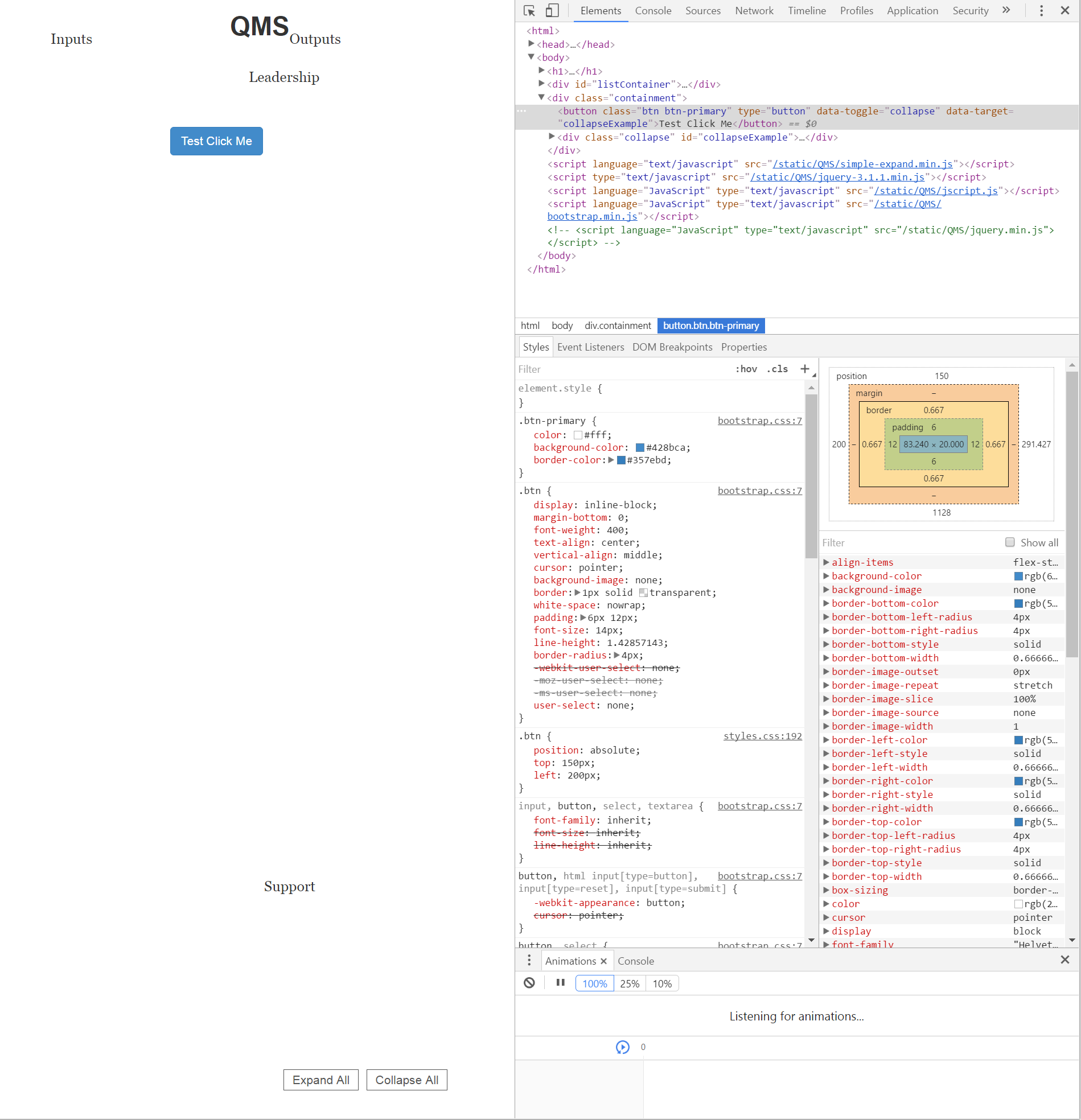 我试图添加一个按钮到我的简单网页,将展开显示超链接列表时展开。我决定解决这个问题,我将使用引导,但我无法使它工作,我的同事也找不到问题。该按钮与引导CSS、JS和JQuery一起加载(3.1.1)。这是令人讨厌的,因为我在搜索解决方案时发现的几乎每一个修复都是缺少的jquery.min.js文件。