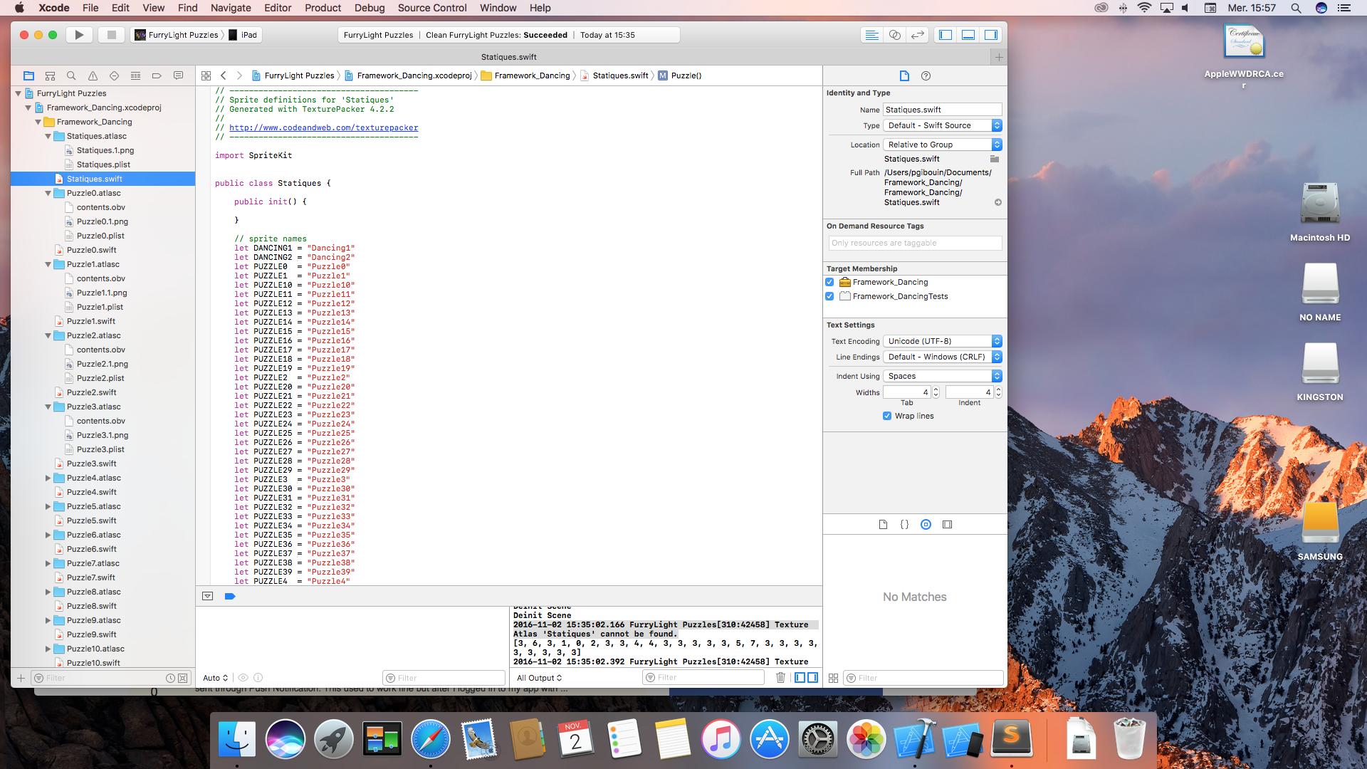 为了减轻我的Xcode项目,我决定把我的资产:由TexturePacker生产的雪碧片放在一个框架中。当它们包括在主要项目中时,作为内部资源来源,一切都很好。但是当我把我的地图集放在一个框架里时,代码编译的很好,没有错误,这个应用程序在物理设备(一个iPad)上运行的很好,但是我有一个红十字会而不是我的精灵。我从控制台获得以下错误消息: