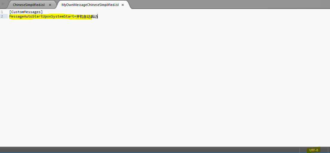 我正在尝试创建包含自定义多语言消息的Inno安装.isl文件。但是,当我在.isl文件中输入中文,然后编译安装程序时,安装程序没有正确地以中文显示我的消息,它会显示随机字符。