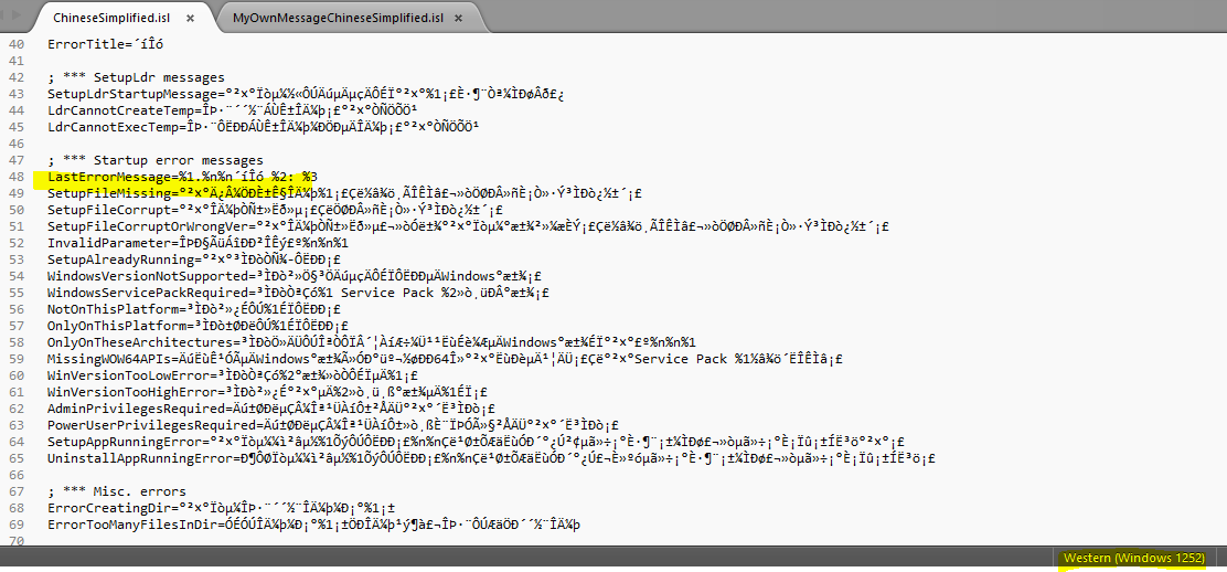在检查非官方中文.isl文件时,我发现当我在文本编辑器(崇高)中打开该文件时,它会显示随机字符,这些字符在运行安装程序时会正确显示。