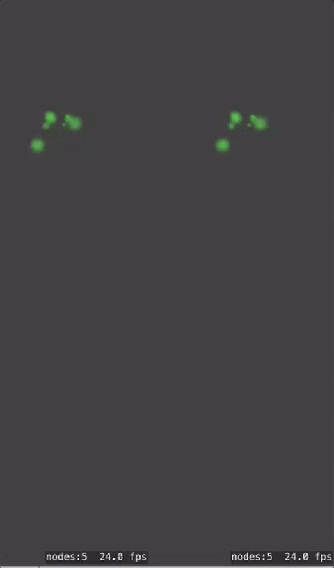 然后,在你的游戏场景中,只需添加一个发射器,它将在这两个视图之间共享。因为只使用一个发射器,所以发射的粒子(它们移动的方式)将被镜像。所以在游戏场景中,只需添加一个粒子: