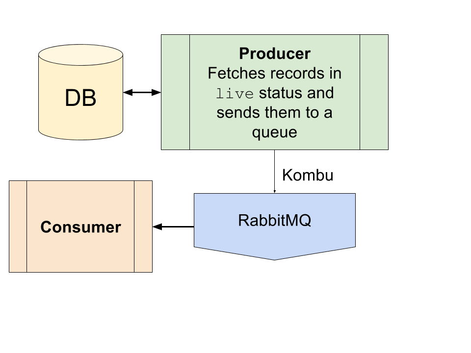 我已经解决了这一问题,使用了一个经典的生产者-消费者架构与Kombu和RabbitMQ。生产者每隔几秒钟从数据库中获取记录,由使用者处理它们。