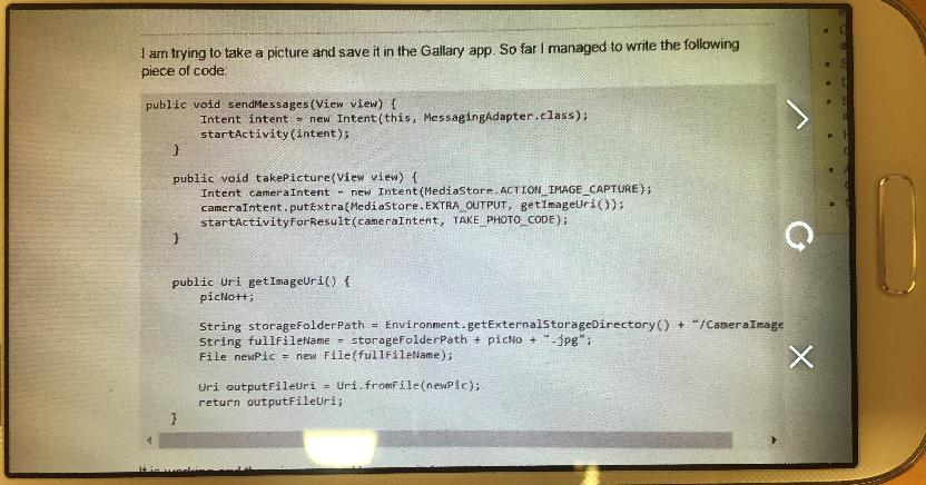 我正在尝试拍摄一张照片,并将其保存在画廊的应用程序中。到目前为止,我成功地编写了以下代码: