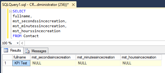 这里唯一的缺点是,由于这些字段是在CRM中直接计算的,因此您将无法编写任何SSRS报告,因为数据不会被持久化到数据库。如果要实现这一点,然后对这些字段执行SQL查询,则会发现它们都为空。这些字段只是作为占位符。(见截图)