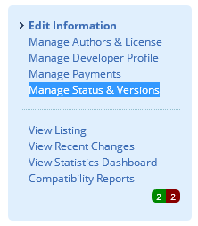 在AMO Developer Hub上,在加载项的控制面板中,选择"Manage & Versions“(彩色左菜单列表顶部的底部选项):
