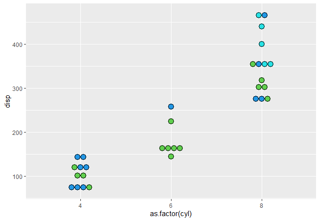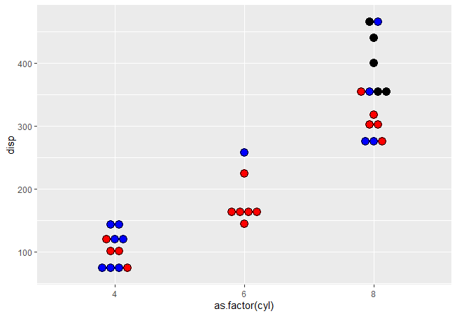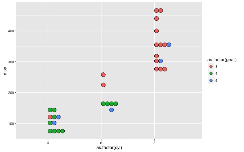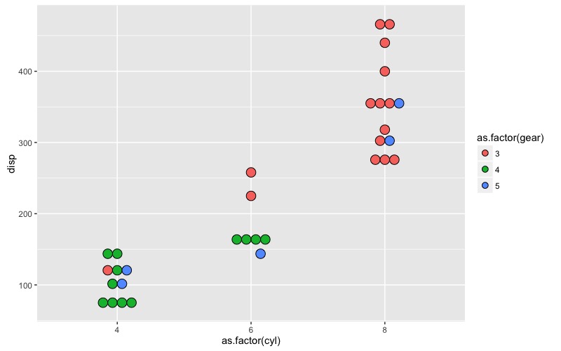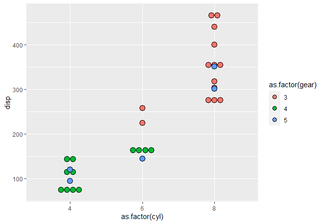 nododge <- ggplot(mtcars, aes(x=as.factor(cyl), y=disp, fill=as.factor(gear))) +