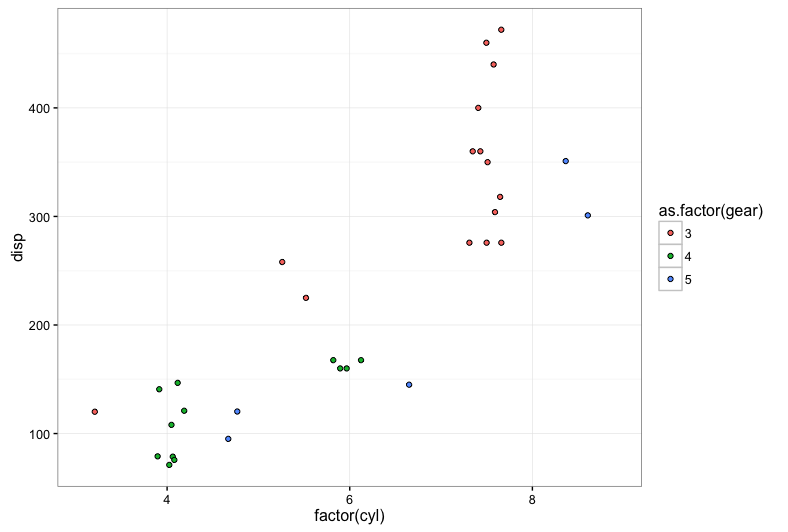 在下面的例子中,我们使用cyl作为x变量,disp作为y变量,gear作为颜色美学。