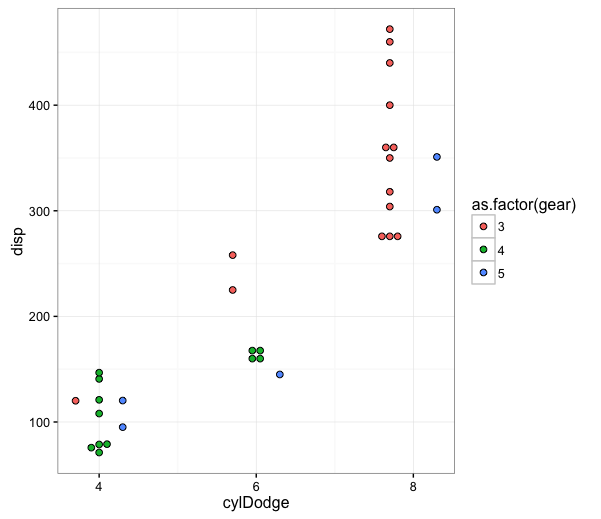 cyl中,我们都希望gear能避开点数。gear中,我们希望具有disp相似值的点水平地分开,这样它们就不会重叠。我们通过向cyl的值添加适当的增量来实现这一点,以便移动点的水平位置。我们使用两个参数来控制这一点:dodge通过gear来分离各点组,而sep则控制具有类似disp值的每个gear内的点的分离。我们通过创建一个名为disp的分组变量来确定“类似的值”,该变量仅将disp四舍五入到最接近的10(当然,这可以根据数据的规模、绘制点的大小和图形的物理大小进行调整)。