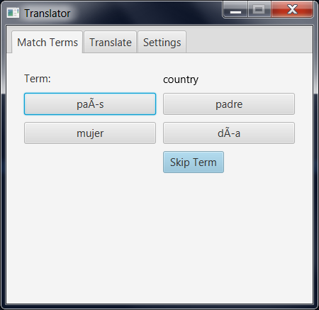 文本有四个地方可能被错误格式化:一个术语列表被发送给译者,后者使用一个web服务来检索翻译(1)。然后将它们缓存在文件(2)中,并由解析器(3)加载,使数据可在JavaFX窗口(4)中显示。我已经检查了这些文件,它们是有效的UTF-8,解析器只有在加载现有文件时才运行,而新部署中没有任何文件。所以我把它缩小到了JavaFX窗口中的显示器。
