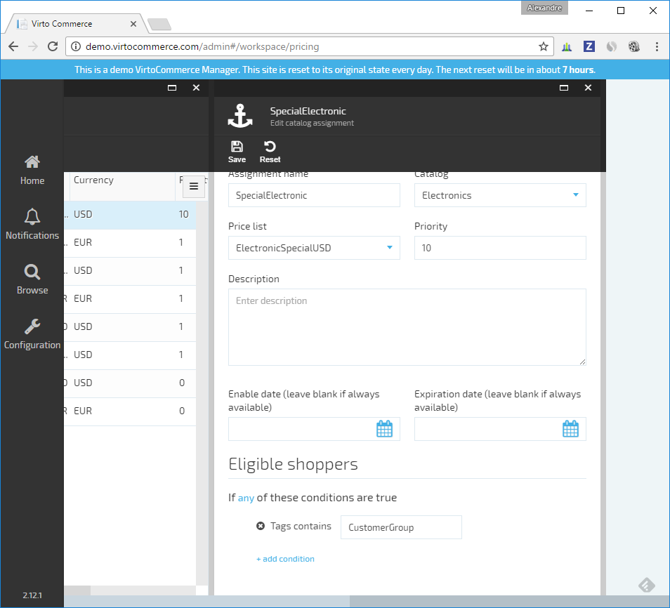 您可以使用标记指定客户组,需要将标记添加到店面上的customer对象中,也可以轻松创建自定义表达式- https://virtocommerce.com/docs/vc2devguide/working-with-platform-manager/extending-functionality/composing-dynamic-conditions。