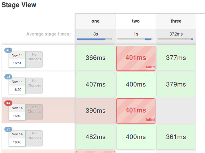 two失败,因此three不会运行。two失败并显示为这样,但three仍在运行。真正的Jenkins可能会显示整个版本#6,略带红色,这当然很好。