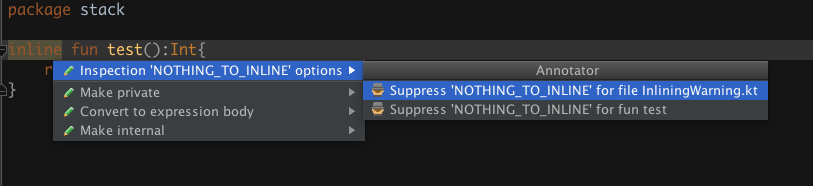 它添加了@Suppress("NOTHING_TO_INLINE")来解决警告。