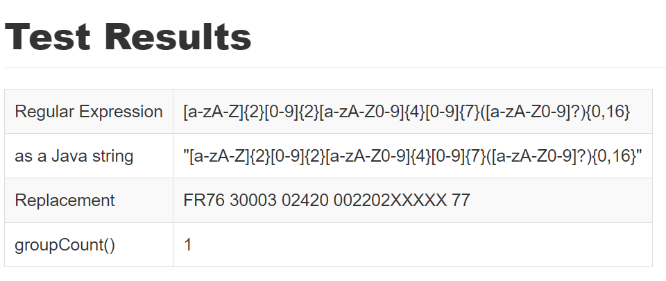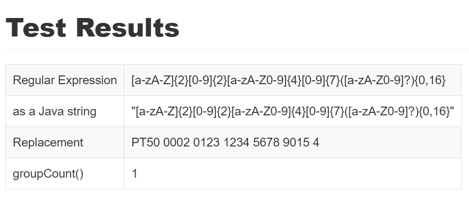 [a-zA-Z]{2}[0-9]{2}[0-9a-zA-Z]{10,30}但这与格式化的IBAN类似(正常,我没有引入白空间检测)不匹配: