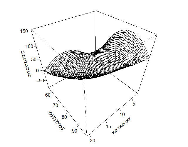 visreg2d(plot.type = "persp")使用persp()创建一个图形。如果我没记错的话,persp()不能使用expression()作为标签,也不能选择移动标签(您可以使用\n(中断)(如xlab="\nx-label")粗略地移动它)。因此,您需要使用text()手动执行此操作。这需要两个值,文本角度和中心坐标。在过去,我创建了一个函数来计算这些值(我引用了R邮寄帮助),我会显示它。
