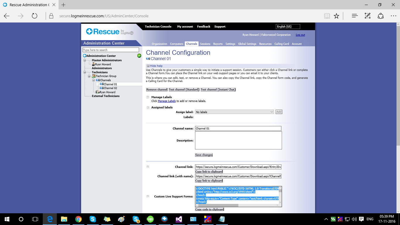 步骤1:登录Logmein救援管理中心,转到频道选项卡,并使用自托管即时聊天复制自定义实时支持表单