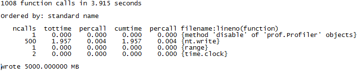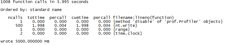 我编写了这段代码,它将10 to块写入一个二进制文件500次。我在Windows764位上使用Anaconda2,我使用了Anaconda加速的分析器。