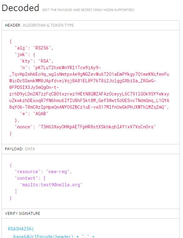 { "type": "urn:acme:error:badNonce", "detail": "JWS has invalid anti-replay nonce 5H63XwyOHKpAETFpHR8stXSkhkqhlAY1xV7VsCnOrs", "status": 400}这至少告诉我,JWT令牌正在被解析,而现在正被查看。当我解码这个JWT时,我看到如下: