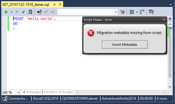 如果打开脚本并删除文件的第一行(以-- <Migration开头)并保存脚本,您应该会看到一个插入元数据的按钮: